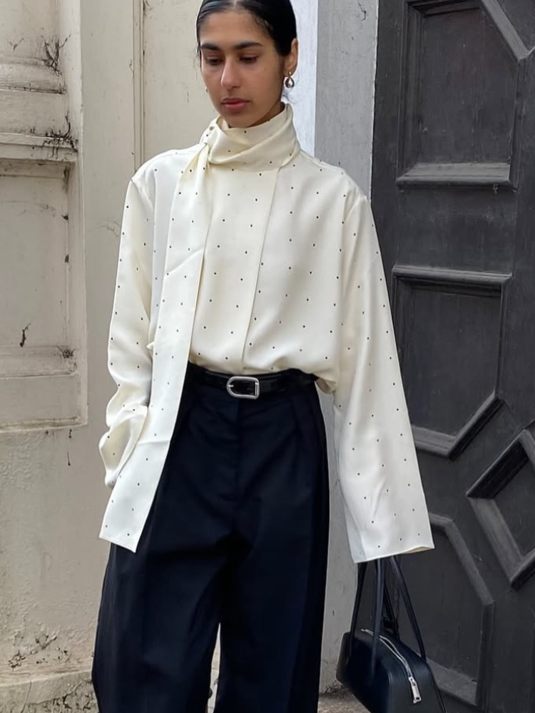 Satin Scarf Neck Polka Dot Printing Women Blouse Fashion Full Sleeve Loose Basic