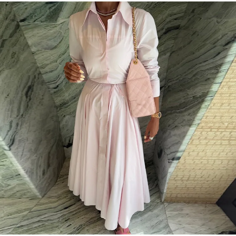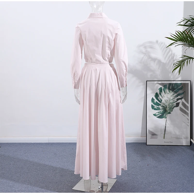 Model Number: Casual Solid Lapel Shirt Long Skirt Set Women