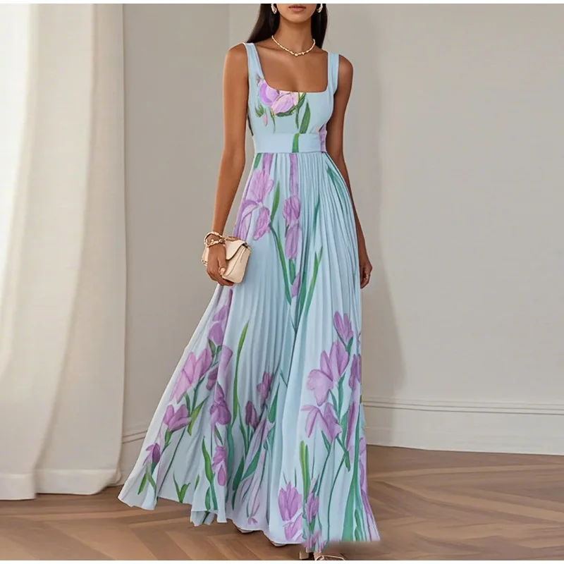 Elegant Print Belt Long Holiday Dress Women Square Collar Sleeveless Backless Pl
