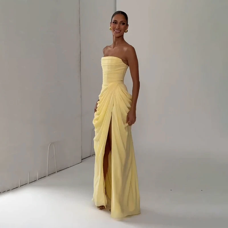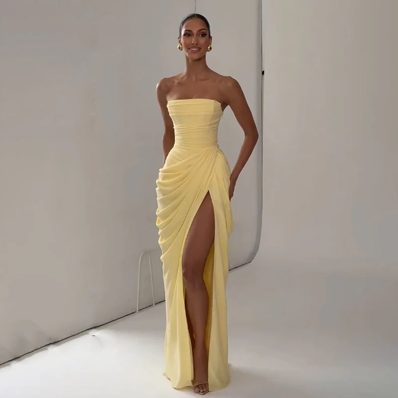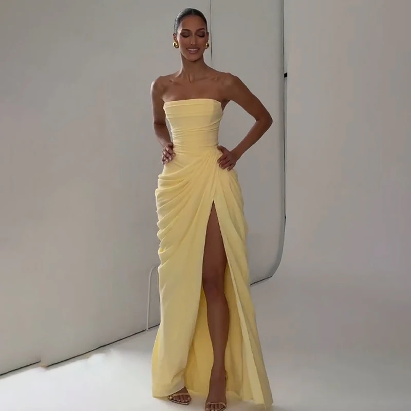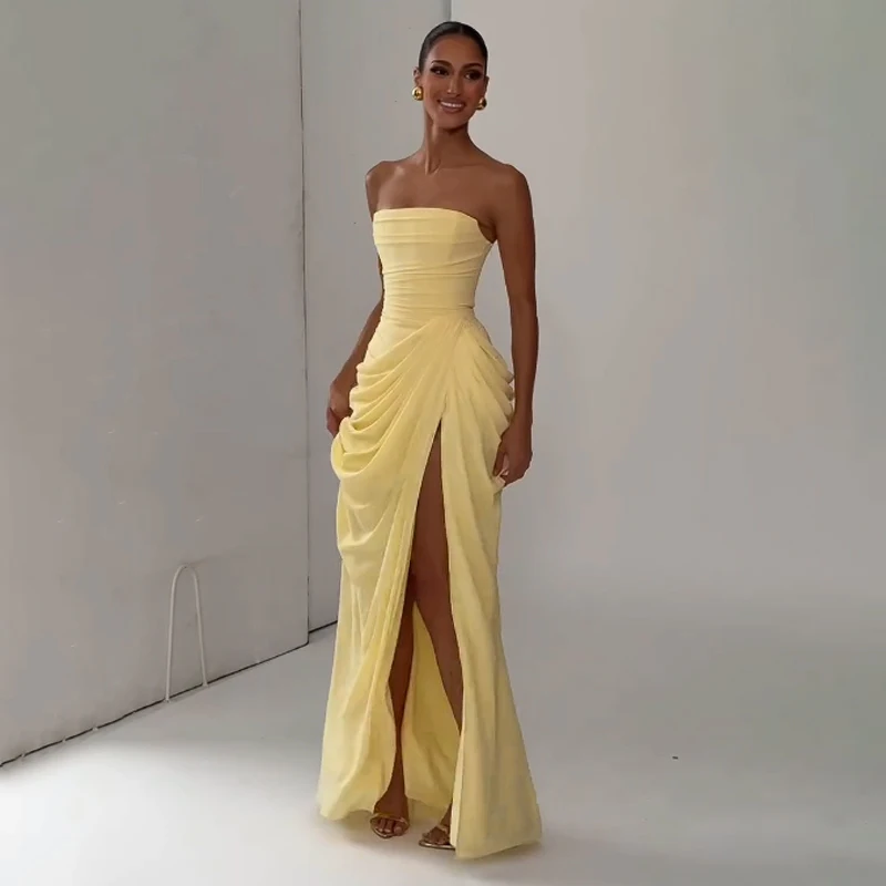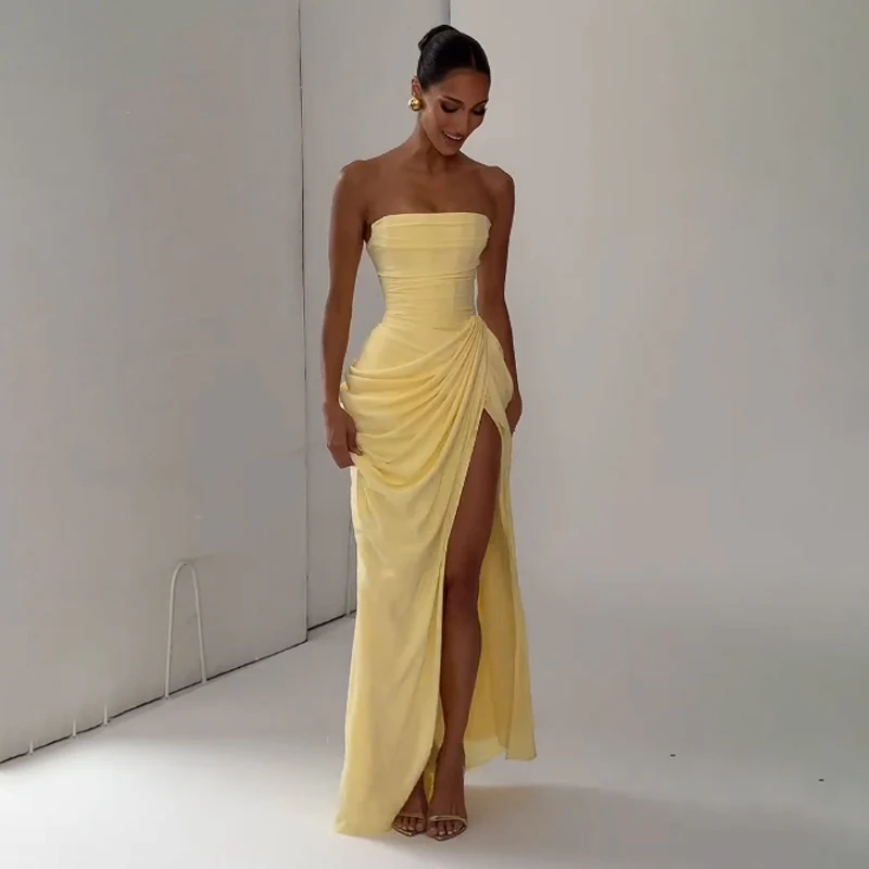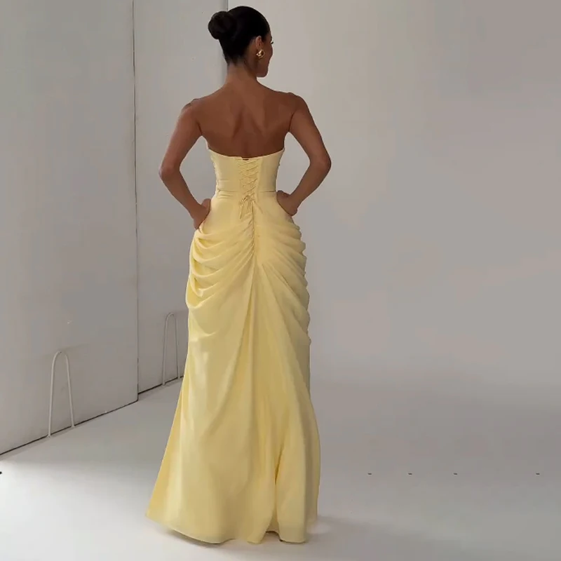 Elegant Yellow Strapless Pleated Long Dress