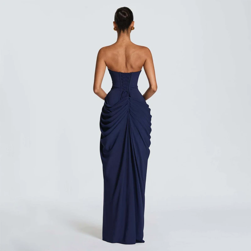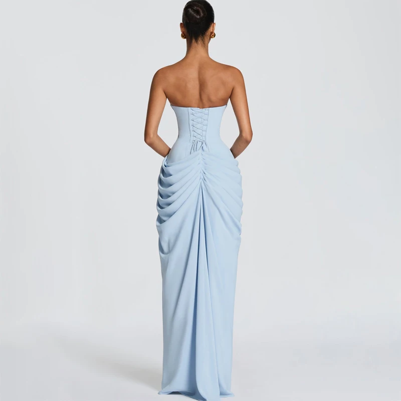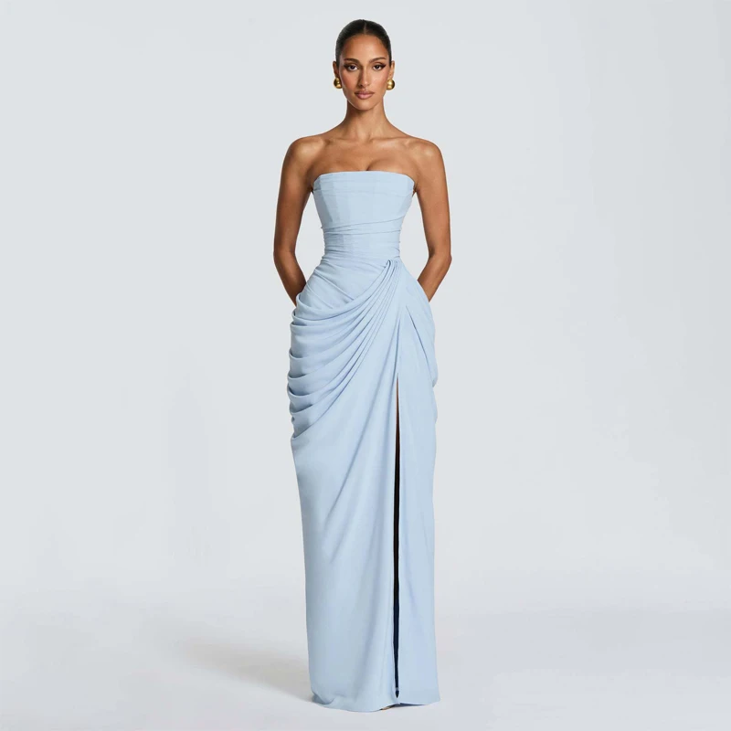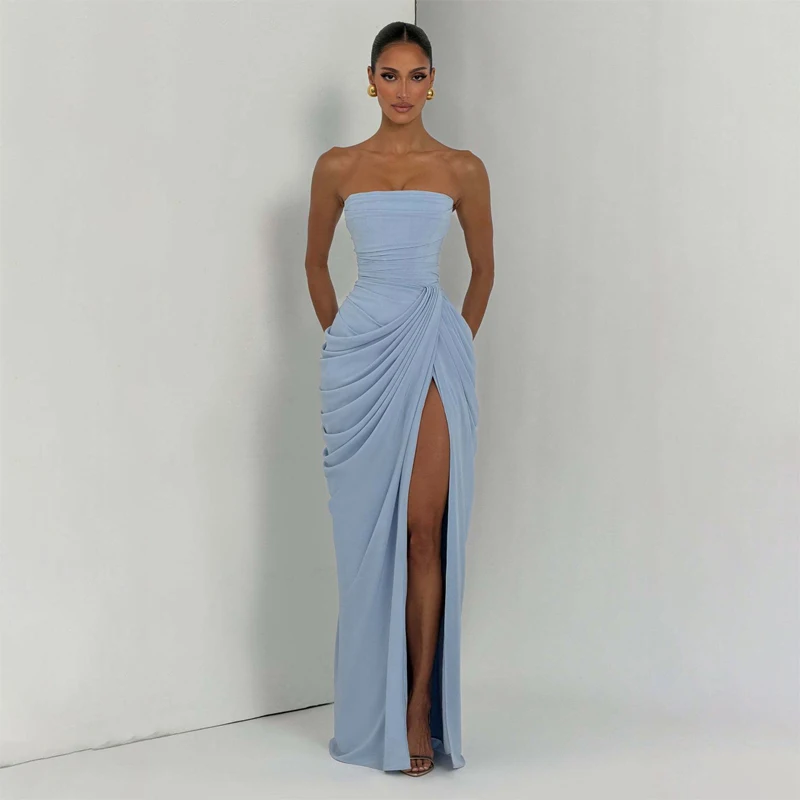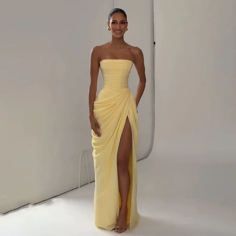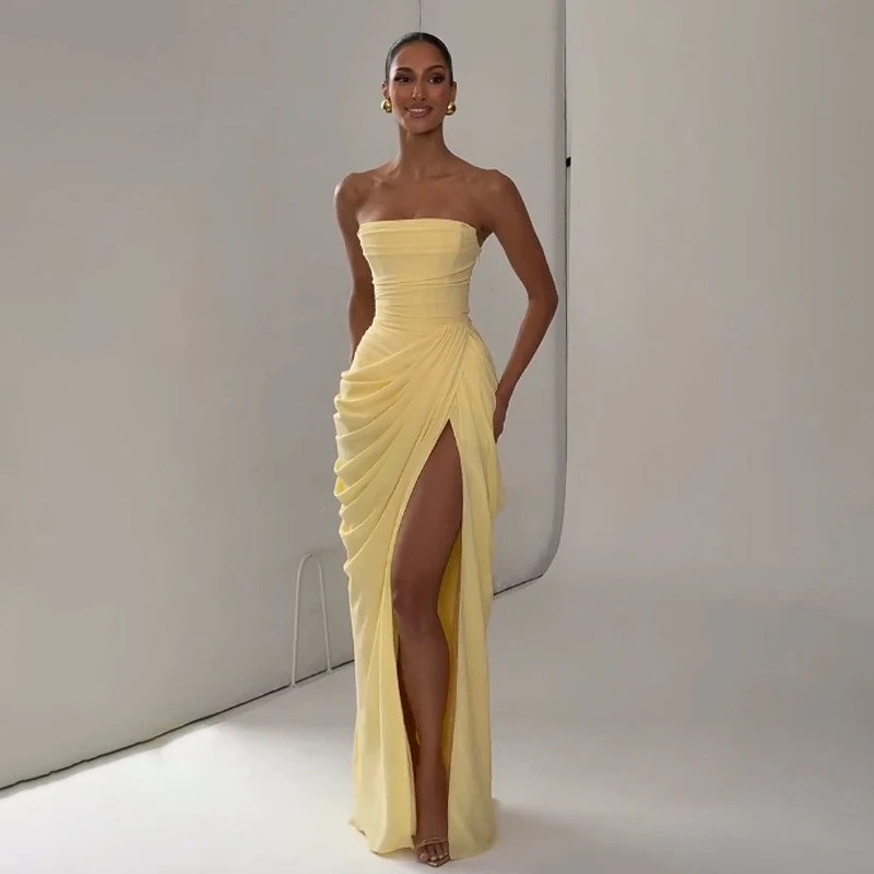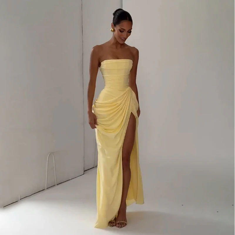 Elegant Yellow Strapless Pleated Long Dress