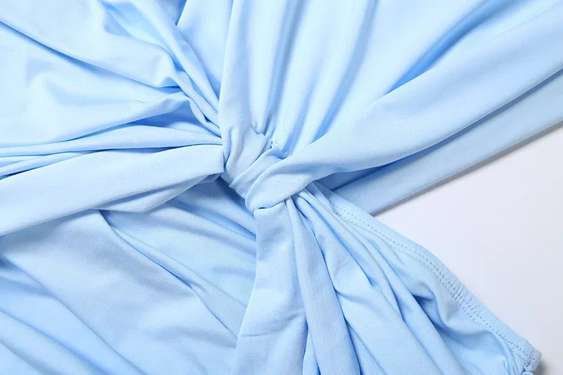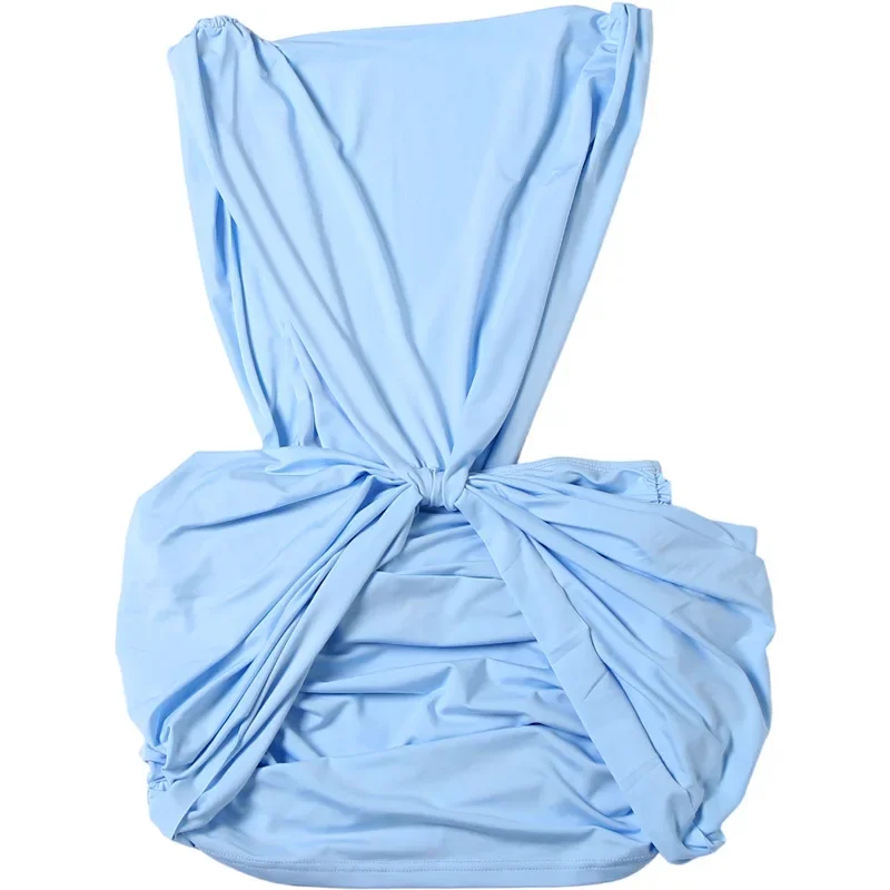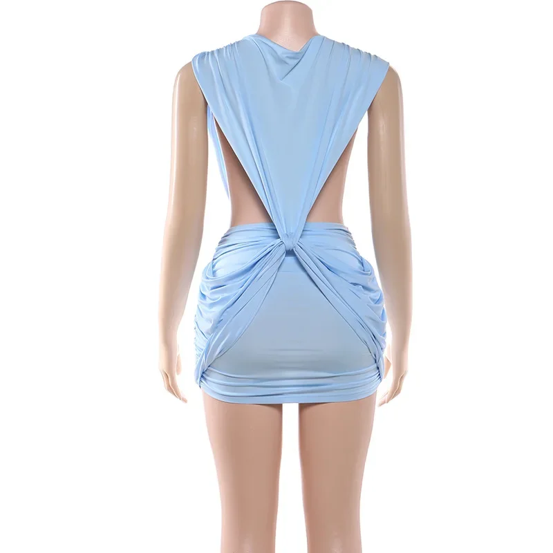 Sexy Blue Hollow-out Pleated Mini Dress Women Deep V-neck Sleeveless Backless Bo