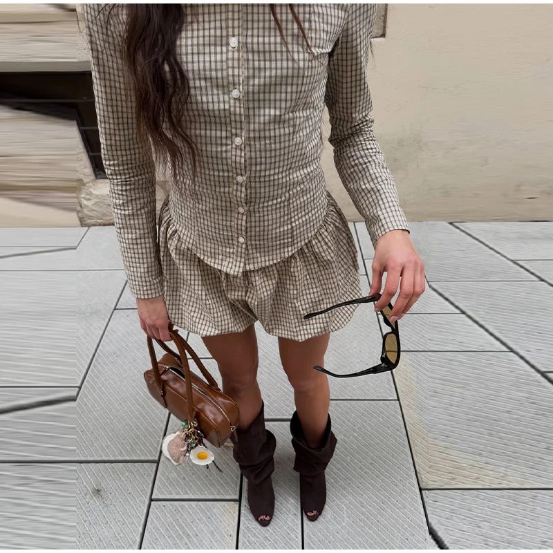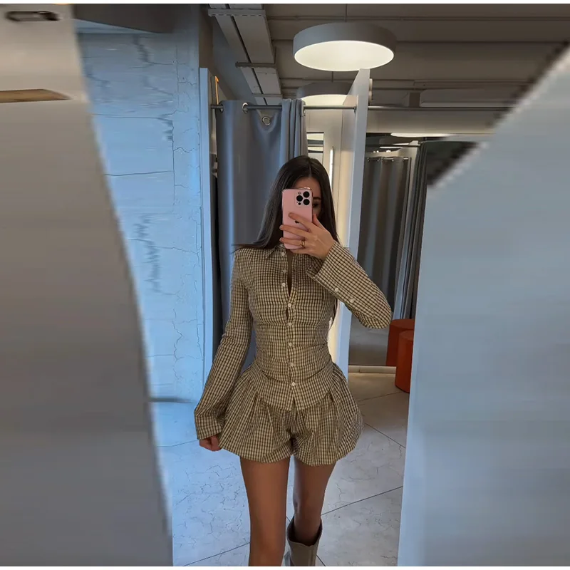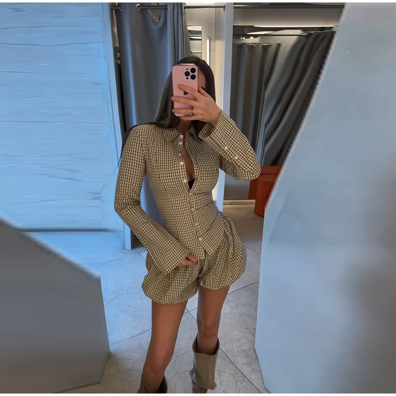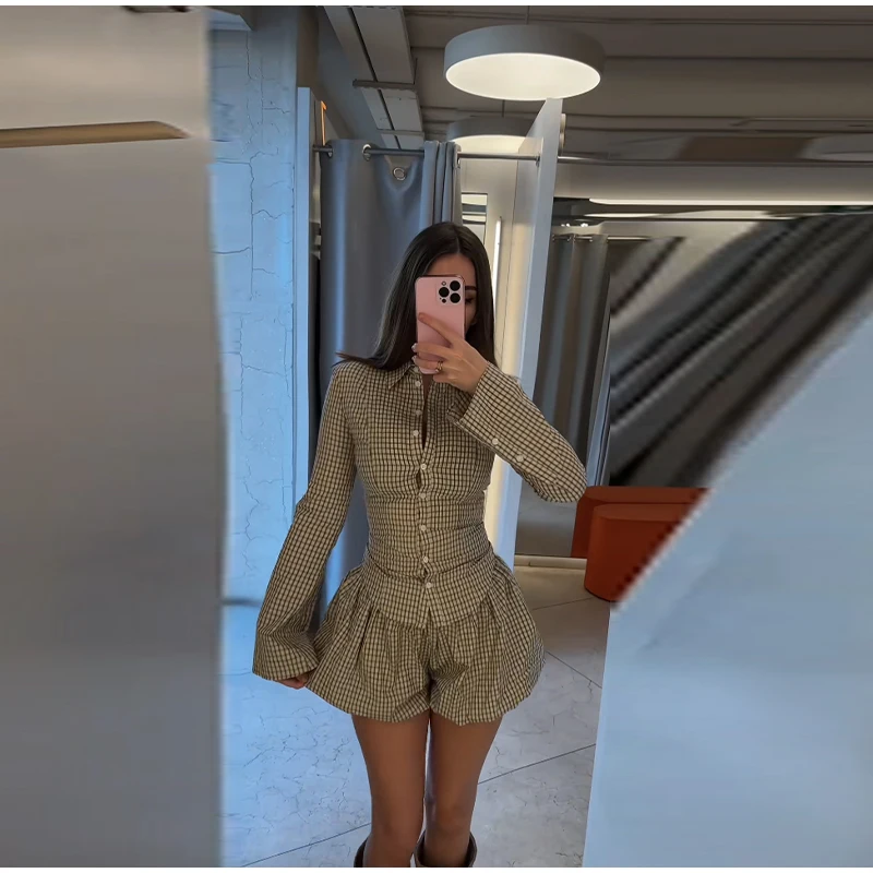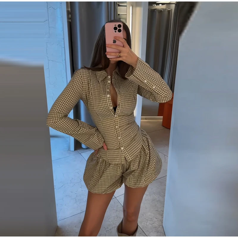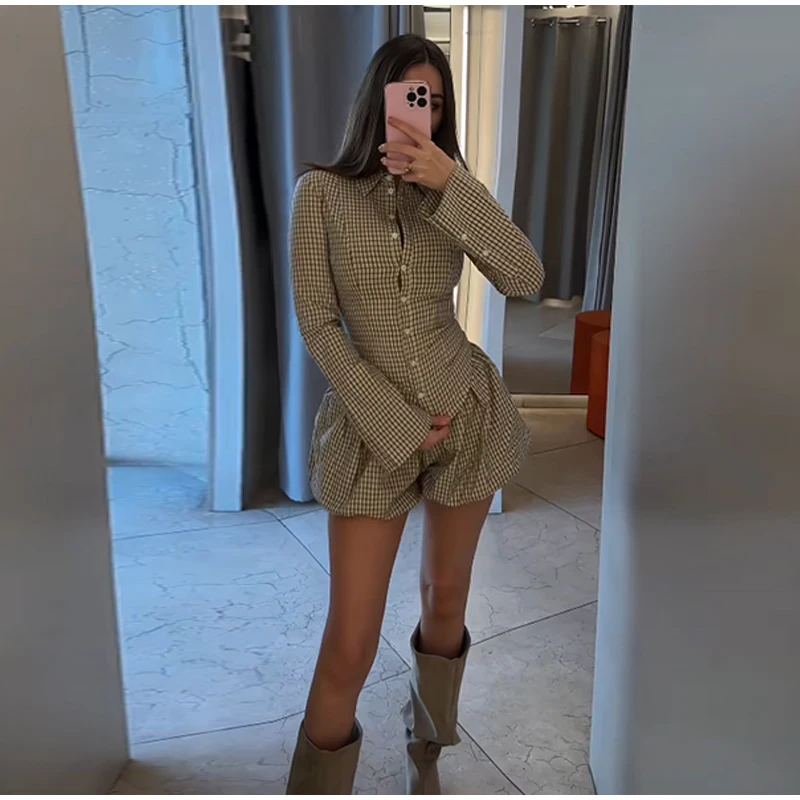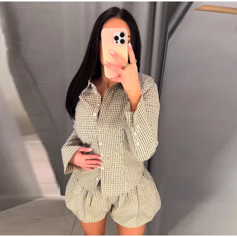 Women Casual Plaid Shorts Set Single Breasted Flare Sleeve Sheath Shirt Bloomers