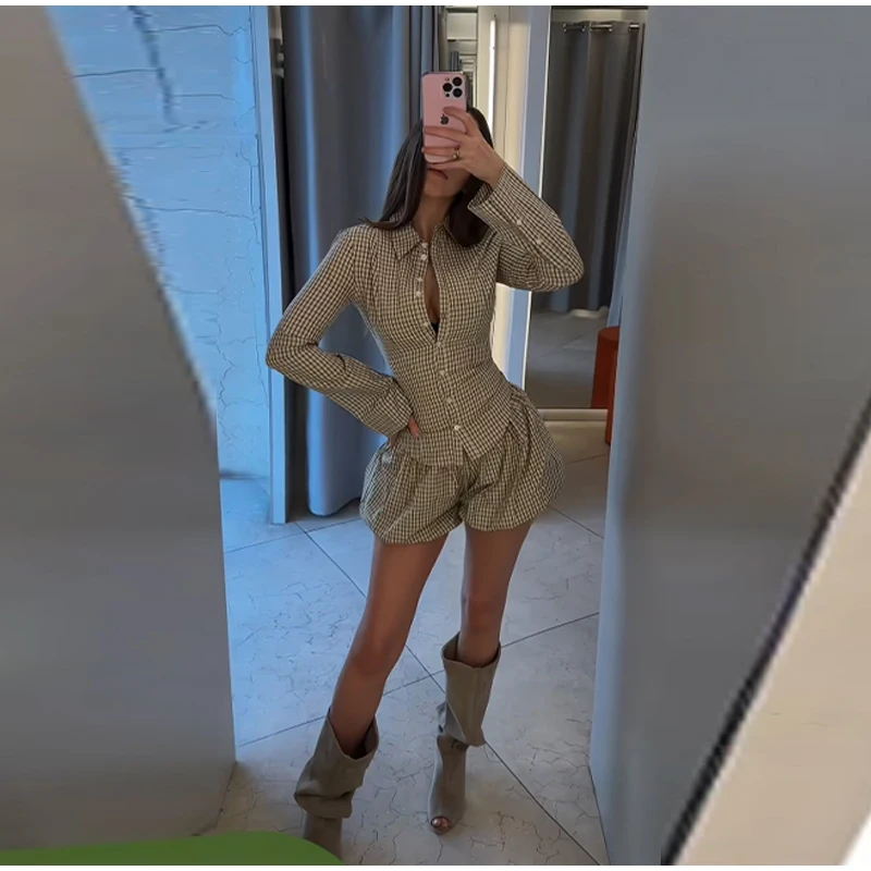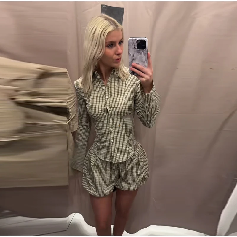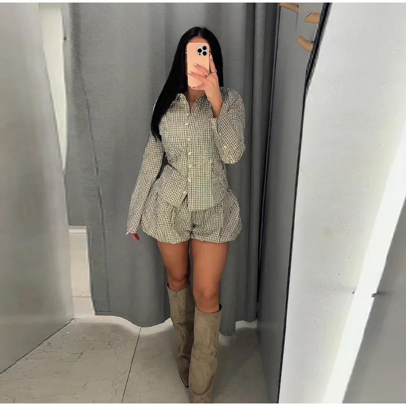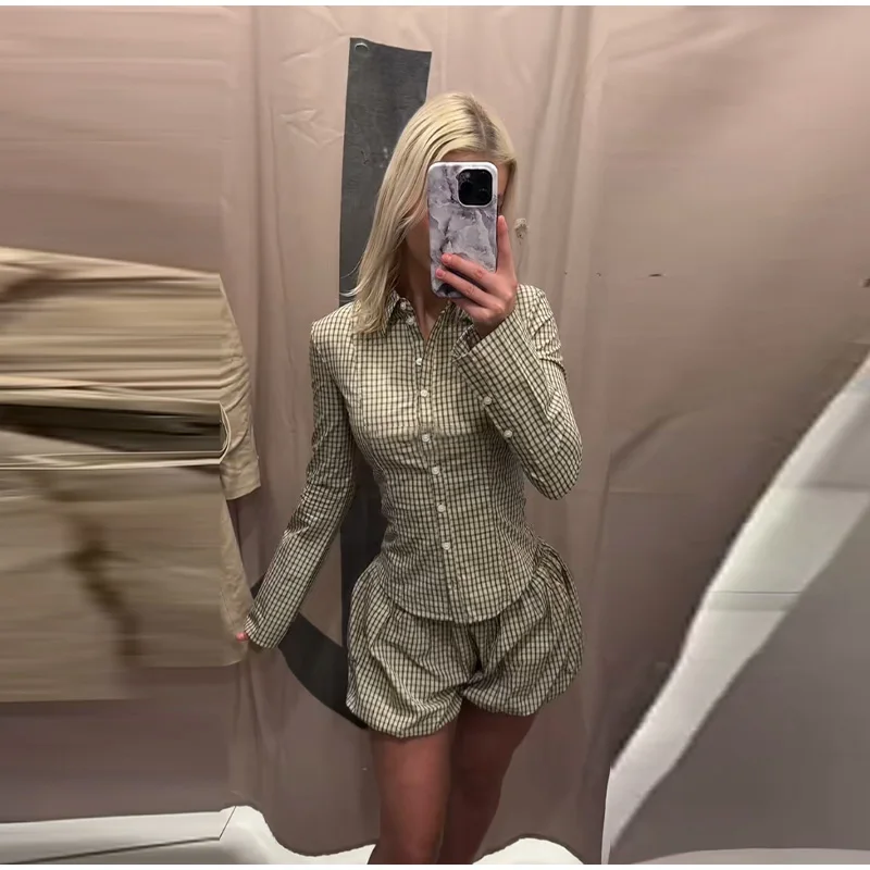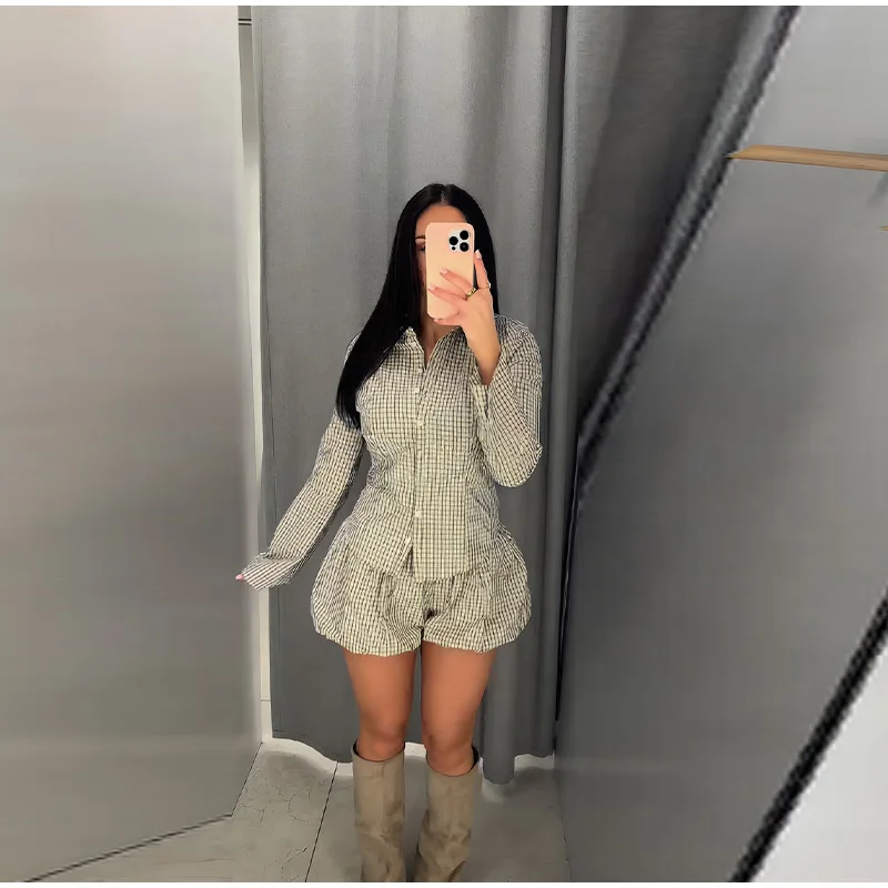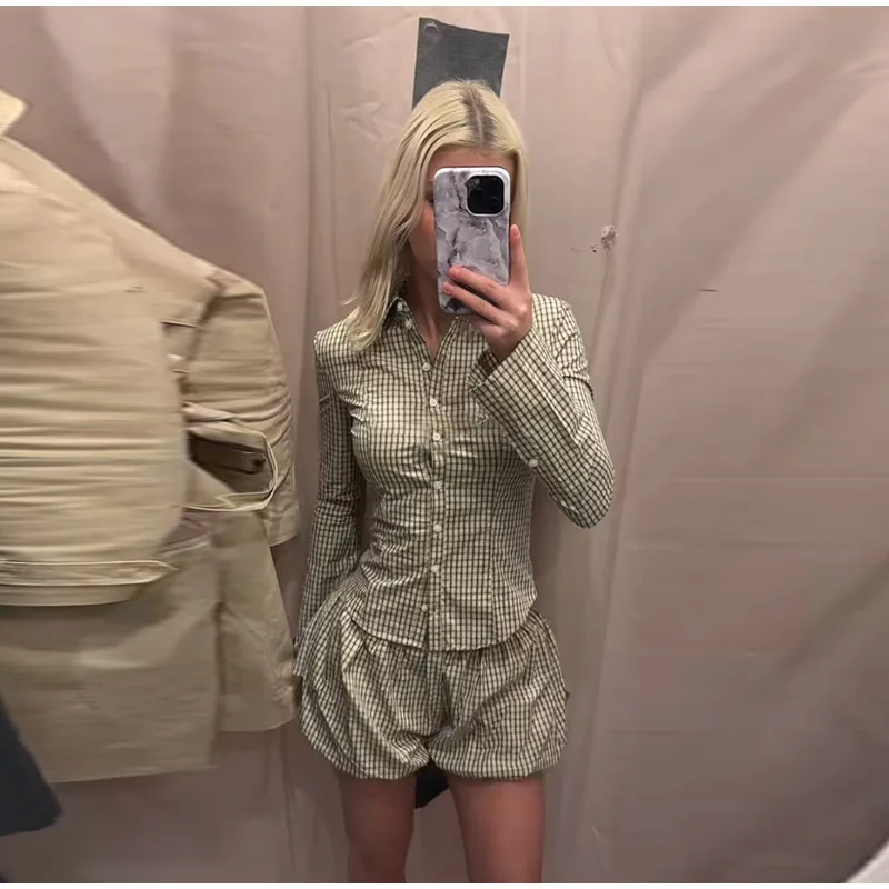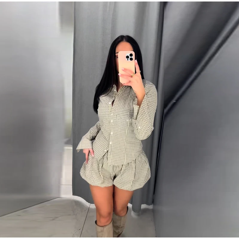 Women Casual Plaid Shorts Set Single Breasted Flare Sleeve Sheath Shirt Bloomers