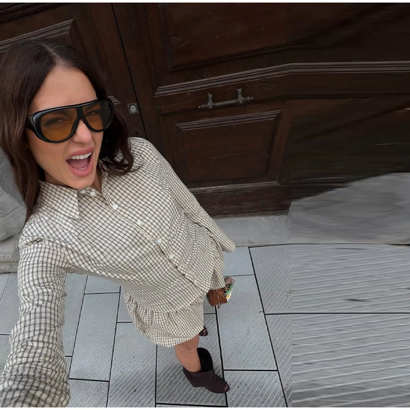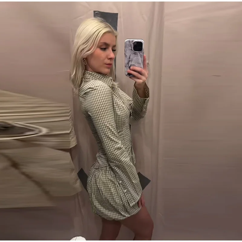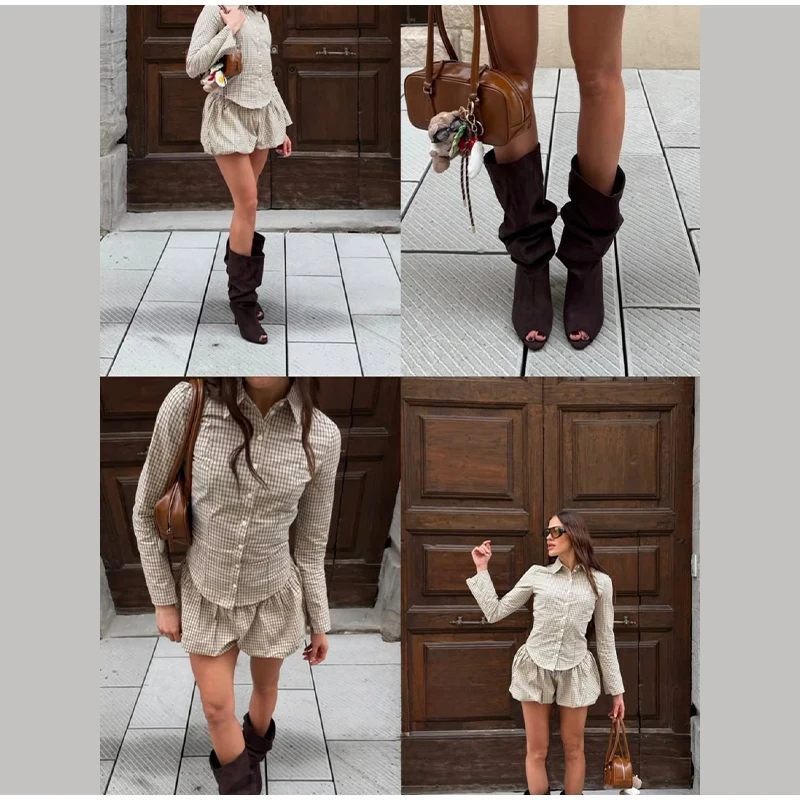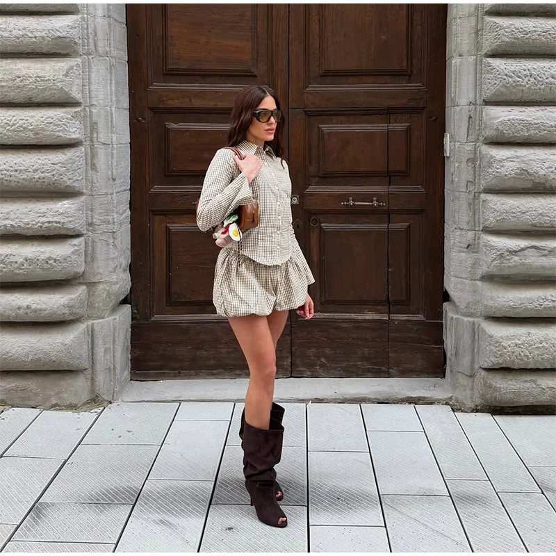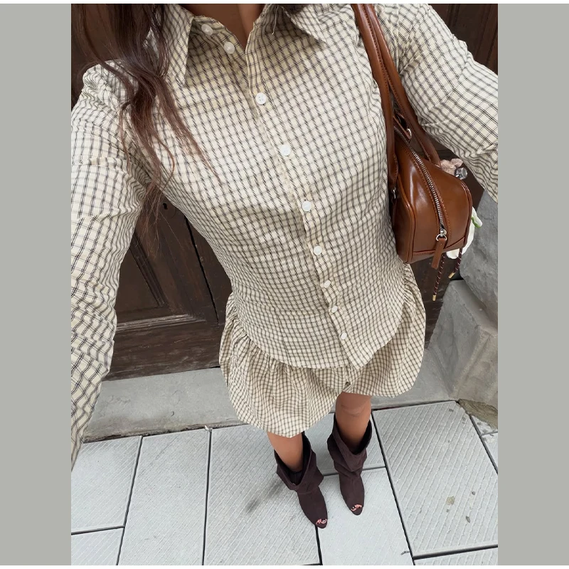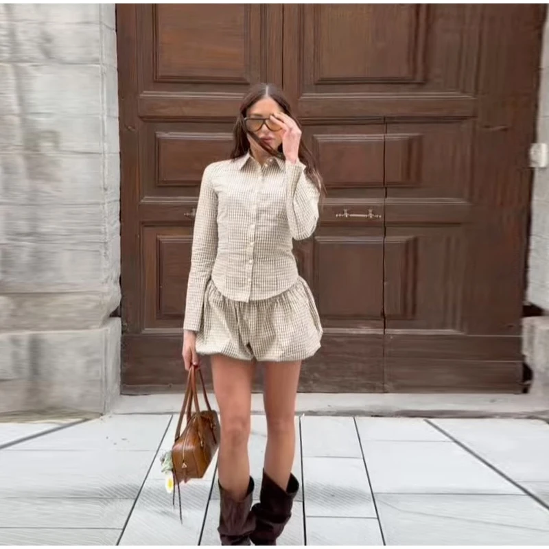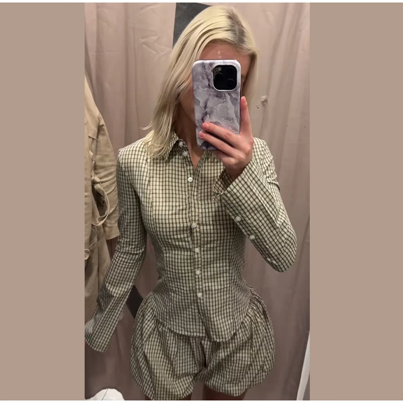 Women Casual Plaid Shorts Set Single Breasted Flare Sleeve Sheath Shirt Bloomers
