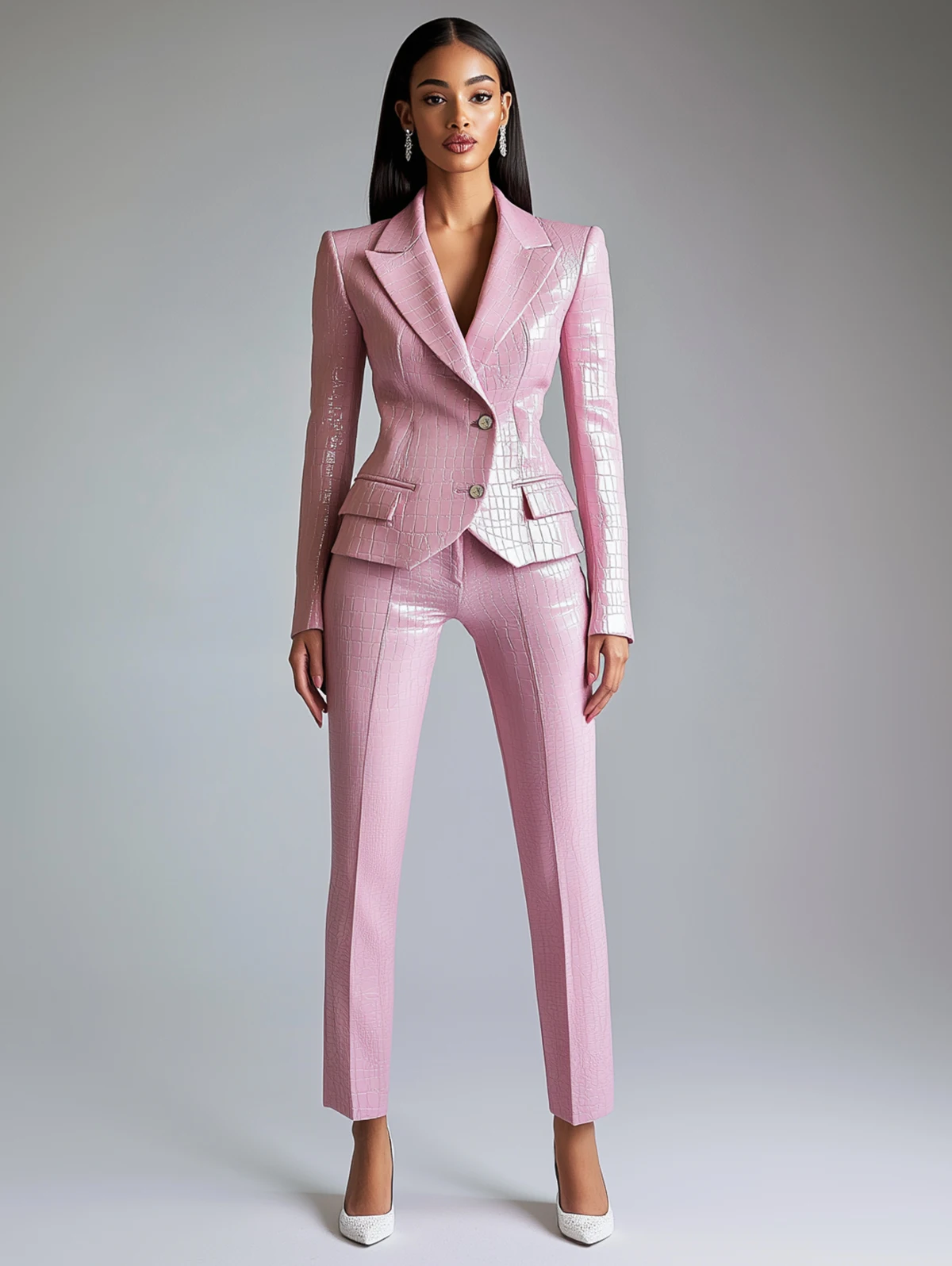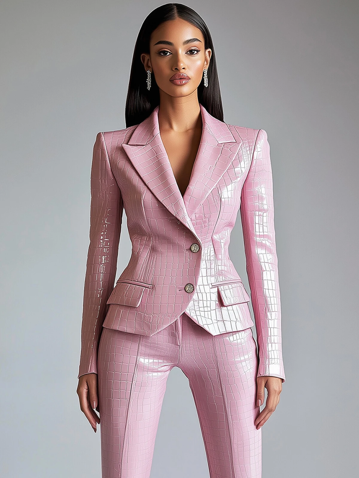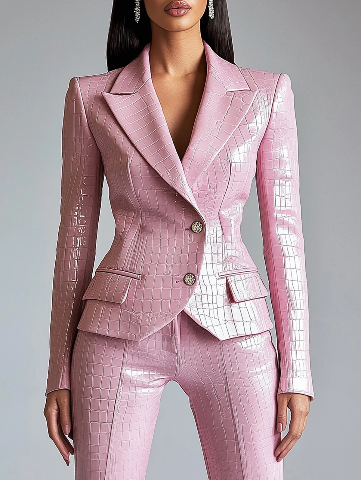 Women Luxurious Alligator Pattern Pu Leather Suit Blazer Pink Single-Breasted La